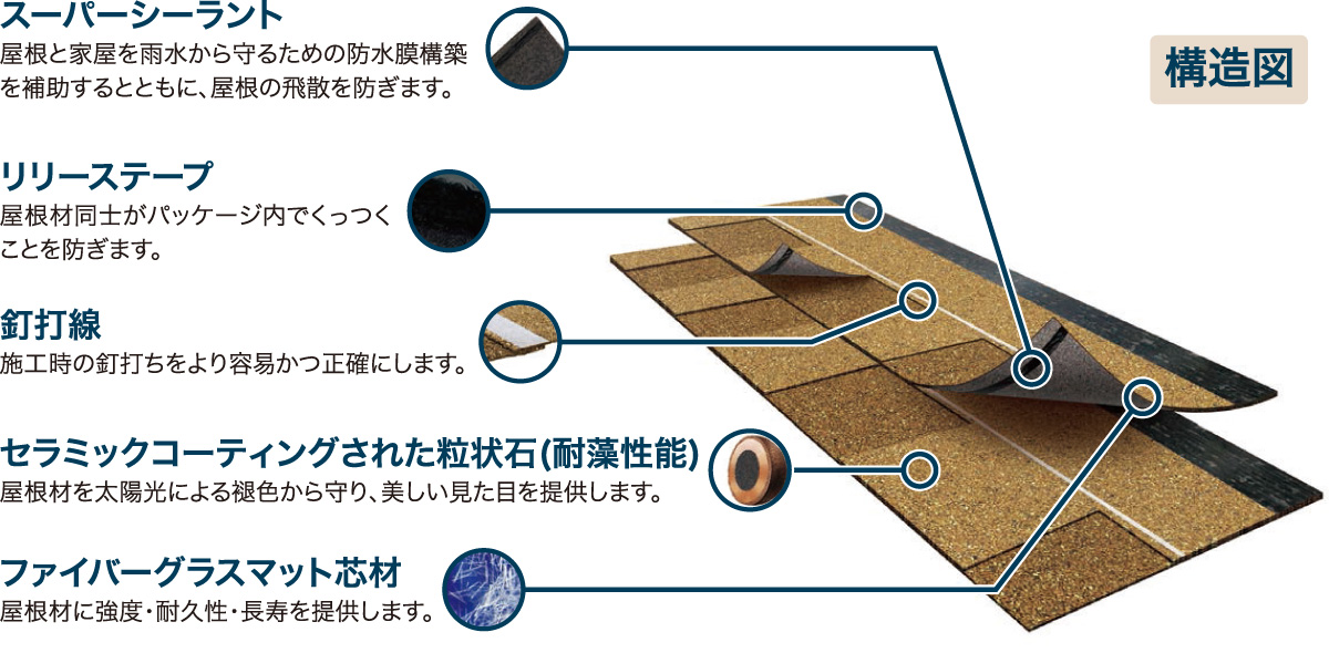 業界トップクラスのファイバーグラスマットを使用し、高耐久化を実現しました。以前のパルプやフェルトを用いたオーガニックシングルに比べ、飛躍的に性能が向上し高い防水性能と長寿命化を実現しました。